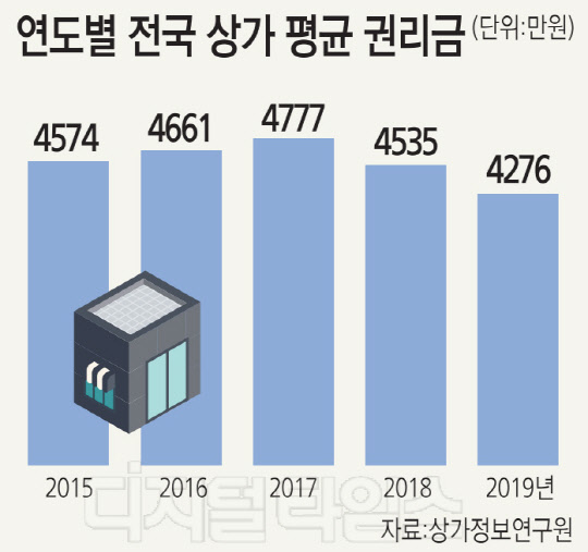 역대 상가 평균 권리금은 2015년 4574만원, 2016년 4661만원, 2017년 4777만원, 2018년 4535만원이었다.