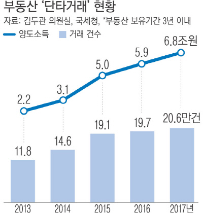 이 가운데 부동산을 1년 이상~2년 미만 보유한 뒤 판매하는 단타거래의 증가세가 두드러졌다. 거래 건수는 2013년 3만2592건에서 2017년 7만8454건으로 141% 늘었다. 2013년 6100억원 규모였던 양도소득은 2017년 2조4631억원으로 304% 상승했다. 거래 건수 및 양도소득 증가율은 보유기간 1년 미만의 거래에서는 각각 38%, 117%이었고 2년 이상 3년 미만 거래는 57%, 182%였다.