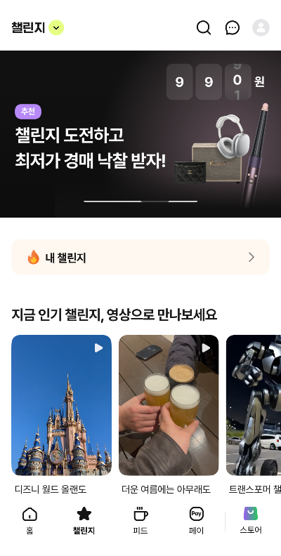 챌린지' 탭을 보면 디즈니 월드에서의 추억, 친구와 맥주 한잔하는 모습 등 일상 속 어떤 순간도 챌린지가 될 수 있음을 보여줍니다. 특히 영상으로도 인증이 가능해져 더욱 생생하고 재미있게 참여할 수 있다는 점이 큰 장점입니다.