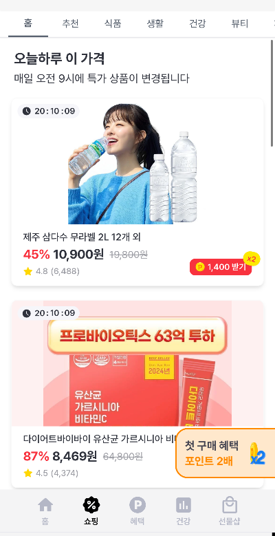 앱 내 '쇼핑' 탭에서는 생수, 영양제 등 다양한 상품을 특가로 구매할 수 있습니다.