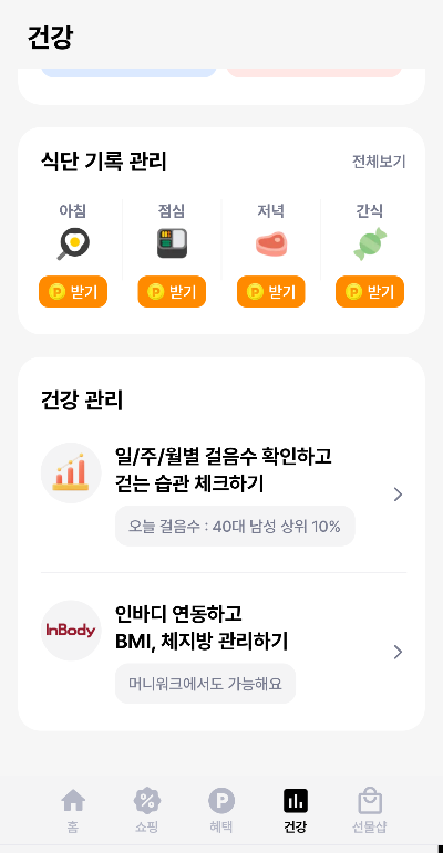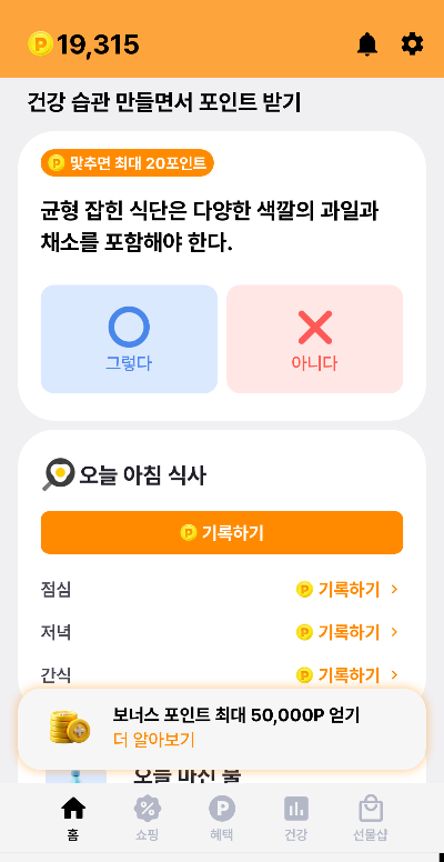 • 식단 기록: 아침, 점심, 저녁, 간식을 기록하기만 해도 포인트가 적립됩니다.