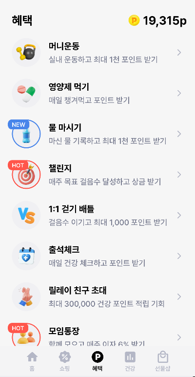 • 다양한 건강 미션: 실내 운동, 영양제 먹기, 물 마시기 등 다양한 미션으로 최대 1,000 포인트를 추가로 얻을 수 있습니다.