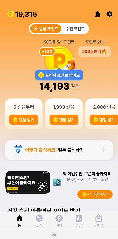 1,000걸음, 2,000걸음 등 특정 구간을 달성하면 '랜덤 받기'를 통해 추가 보너스도 얻을 수 있습니다.
