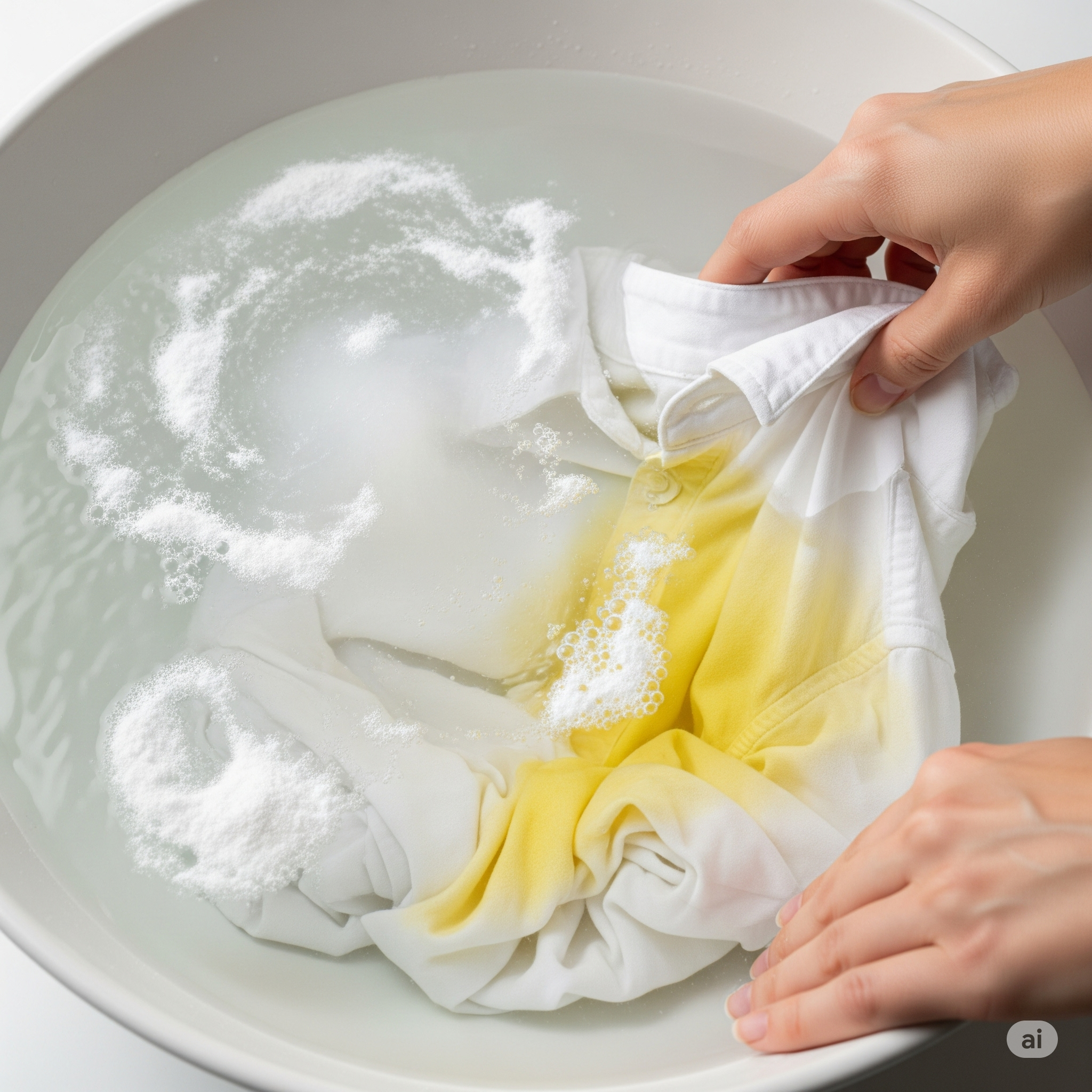 전체적으로 색이 누렇게 변한 흰옷은 **산소계 표백제(과탄산소다)**를 활용해 보세요. 40~50℃ 정도의 따뜻한 물에 과탄산소다를 잘 녹인 후, 30분에서 1시간 정도 옷을 담가두었다가 세탁하면 눈에 띄게 하얘진 것을 확인할 수 있습니다.