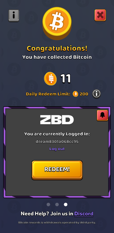 3. ZBD 계정으로 로그인하고 'REDEEM' 버튼을 누르면, 수수료 없이 즉시 ZBD 지갑으로 비트코인이 전송됩니다.