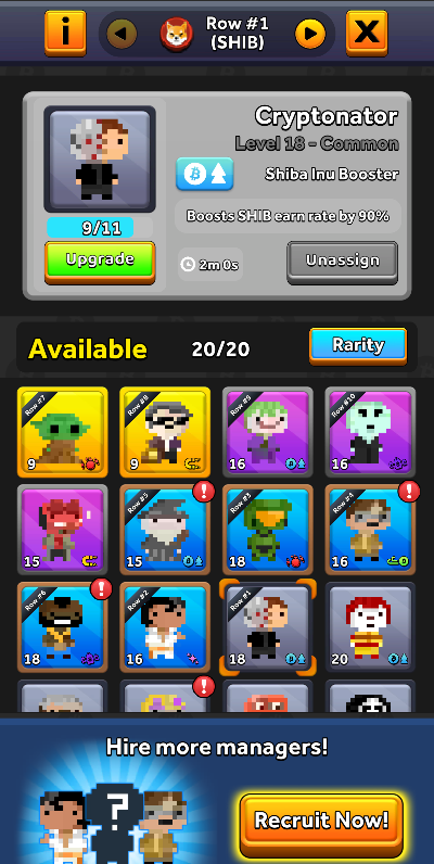 게임을 진행하다 보면 다양한 등급과 능력을 가진 매니저들을 얻을 수 있습니다. 각 매니저는 특정 코인(예: SHIB)의 채굴량을 비약적으로 상승시켜주는 등 고유한 버프를 가지고 있으니, 전략적으로 배치하여 수익을 극대화해야 합니다.