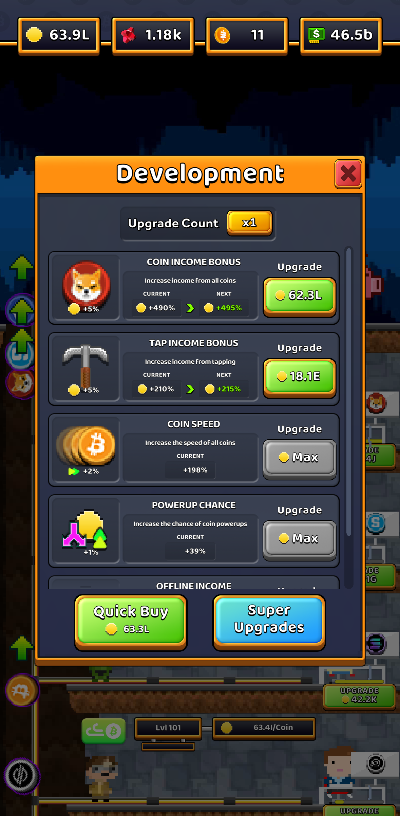 게임의 가장 기본입니다. 화면 아래층부터 채굴기를 고용하고, 게임 내 재화(코인)를 사용해 꾸준히 레벨을 올려주면 초당 채굴량이 기하급수적으로 늘어납니다. 자동화된 수익 구조를 만드는 첫걸음이죠.