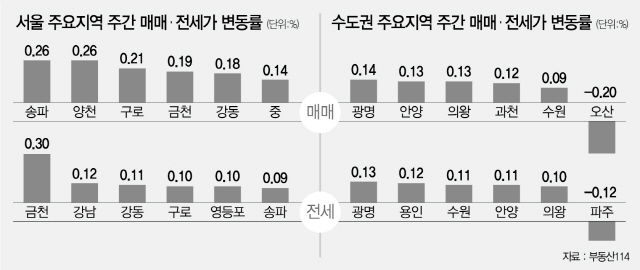 서울 자치구별로는 △송파(0.26%) △양천(0.26%) △구로(0.21%) △금천(0.19%) △강동(0.18%) △중구(0.14%) △관악(0.13%) △용산(0.11%) 순으로 상승했다. 서울지역 전반에 매물이 부족해 강남권과 비강남권 상관없이 고르게 오르는 분위기다. 송파구는 잠실동 리센츠와 엘스가 500만~2,500만원, 신천동 잠실파크리오가 1,000만~1,500만원 올랐다. 양천구는 목동신시가지를 중심으로 500만~3,000만원 상승했다.