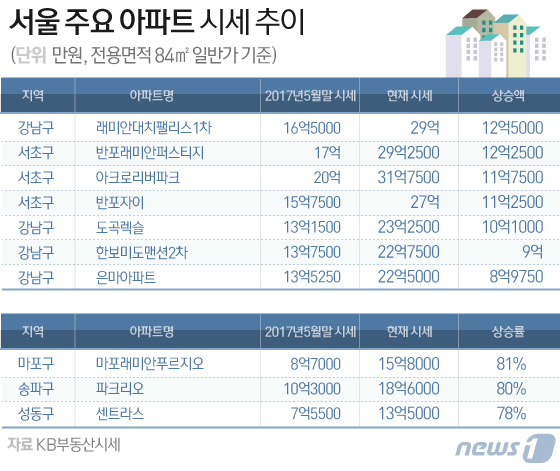 개별 아파트 단지로 보면 집값 상승 폭에 대한 체감이 더 커진다. 은행권 대출 기준이 되는 KB부동산 시세를 기준으로 강남권과 마용성 지역 등의 주요 단지(전용면적 84㎡ 기준) 시세를 비교한 결과 강남구 대치동 '래미안대치팰리스1차'는 2017년 5월말 16억5000만원이던 것이 현재 29억원으로 무려 12억5000만원이 뛰었다.