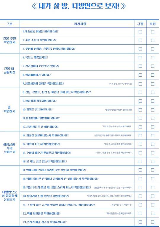 서울에서 같이 자취할 수 있는 지인이 있는 경우에는 투·스리룸을 구하면 월세 부담을 낮추고 더 쾌적한 시설에 거주할 수 있다. 방을 보러 다닐 때도 반드시 체크해야 하는 사항이 있다. 부동산 앱 다방 내 ‘매물 체크 리스트’를 살펴보면 매물 내부와 외부, 건물 내 공용공간, 주변 시설 등 총 23개 항목에 대해 매물을 검토해 보라고 권고하고 있다.