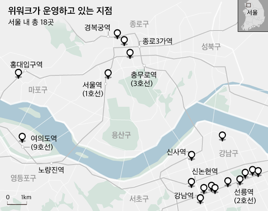 위워크는 서울 19곳에서 공유오피스를 운영하고 있다.