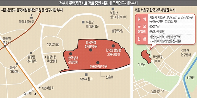 예를 들어 서초구 우면동 일대 한국교육개발원 부지는 서울주택도시공사(SH)가 공공임대주택 340여가구를 공급한다는 계획을 이미 세워놨다. 한국교육개발원 주차장 부지(약 7000㎡)를 제2종 일반주거지역으로 종 상향하고, 이곳에 7층 높이 규모의 공공임대주택 344가구를 공급한다는 계획이다. 정부는 이에 대해 용적률 등을 높이는 식으로 공급 규모를 약 100가구 정도 추가로 늘리는 방안을 검토 중이다. 한 정부 관계자는 “종 상향 등을 통해 주택 공급량을 늘릴 수 있다. 이런 방식으로 서울 내 연구기관 부지를 활용하면 수천가구를 공급할 수 있다”고 말했다.
