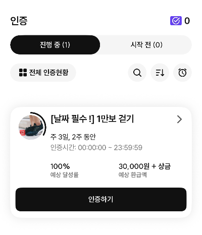 - 예시: "남자 필수! 1만보 걷기" 챌린지 100% 달성 시 30,000원 + 상금 획득