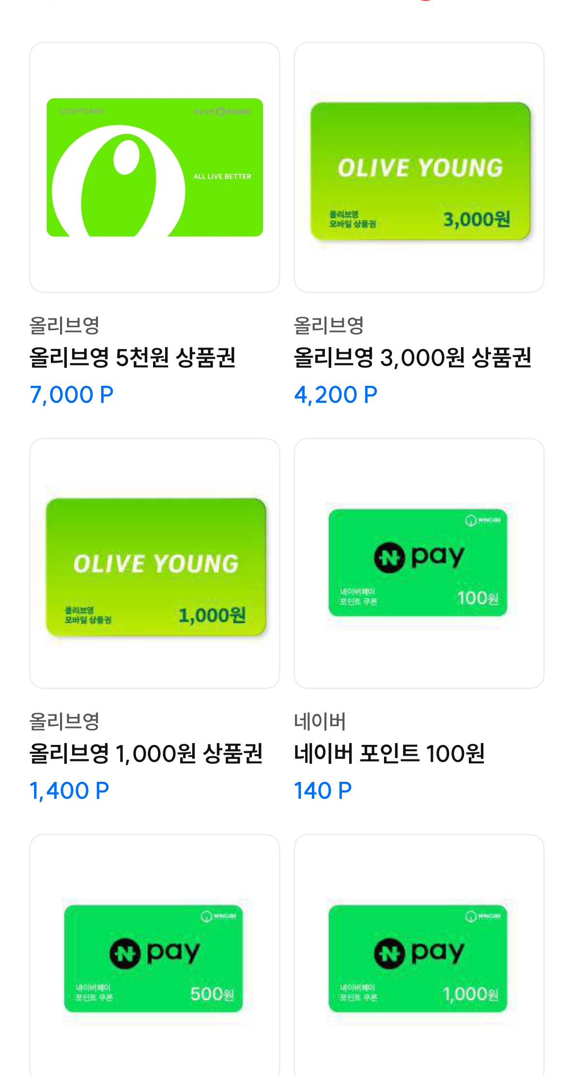 - 올리브영 상품권: 1,000원~5,000원 권종별 선택 가능