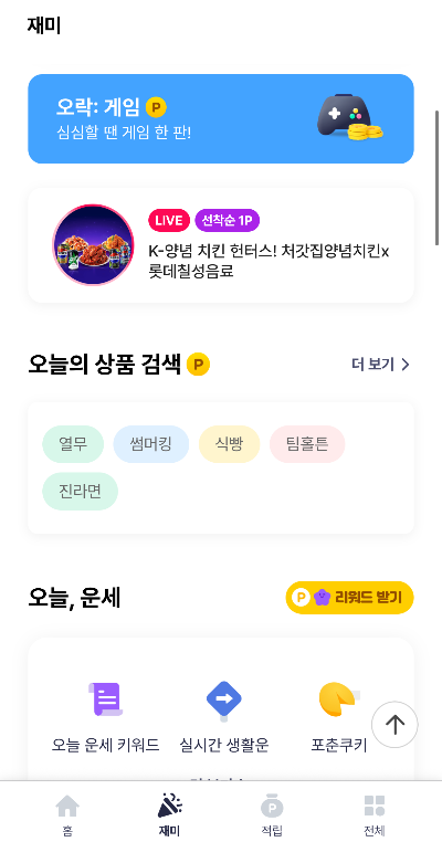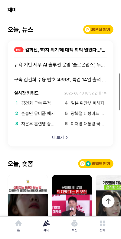 '재미' 탭으로 이동하면 '오늘, 뉴스' 섹션이 있습니다. 최신 이슈, 연예, 스포츠 등 다양한 기사를 읽기만 해도 포인트가 적립됩니다. 출퇴근길 지하철에서 무심코 보던 뉴스가 이제는 내 용돈이 되는 거죠.