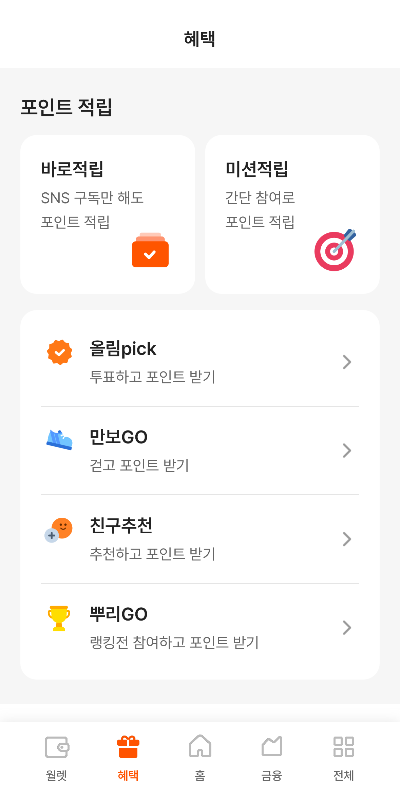 - 올림pick / 뿌리GO: 투표에 참여하거나 랭킹전에 참여하는 등 게임처럼 즐기면서 포인트를 얻을 수 있는 코너도 마련되어 있습니다.