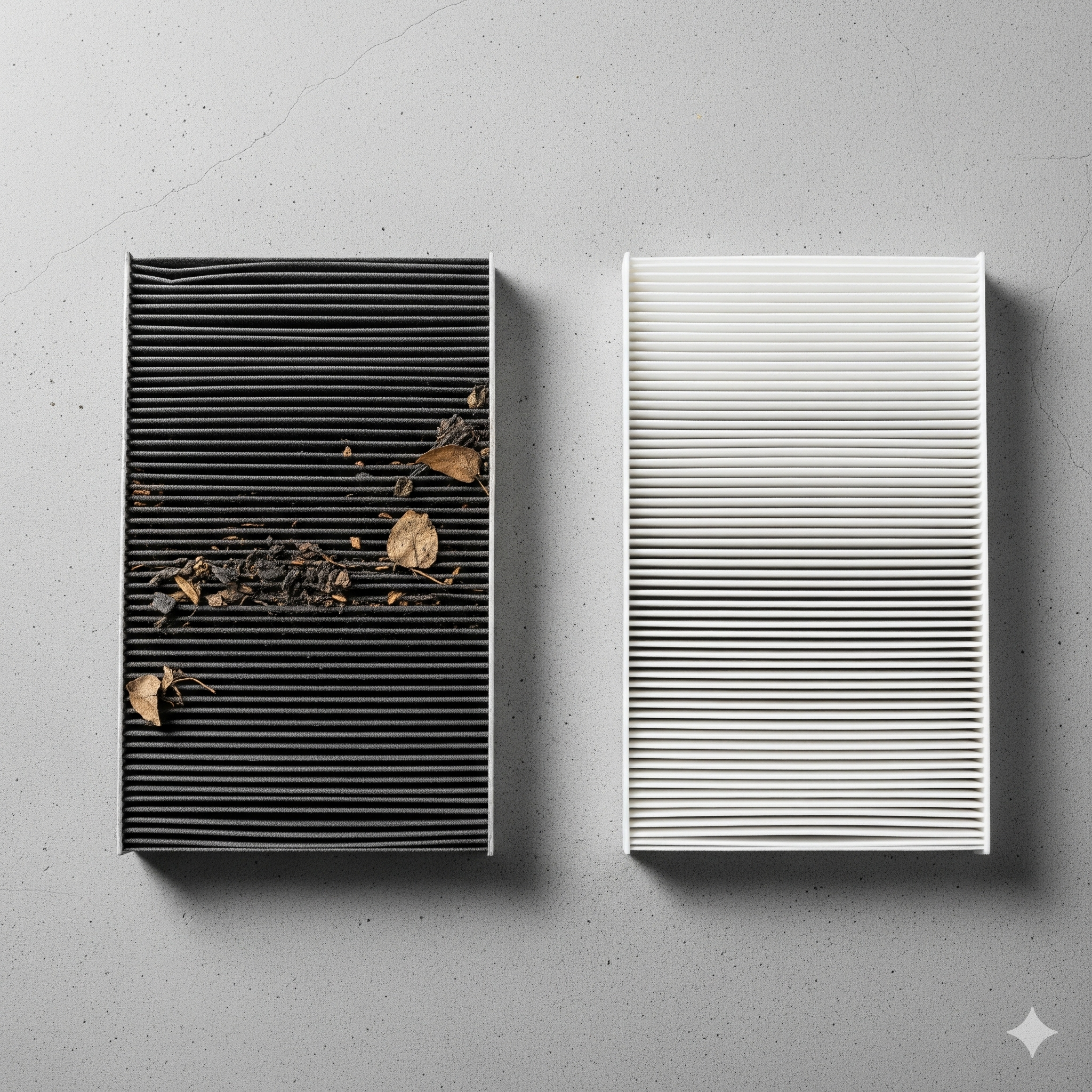2. 1차 방패막이 '에어컨 필터(캐빈 필터)'의 오염 😷 에어컨 필터는 외부의 먼지, 꽃가루, 배기가스 등을 걸러주는 우리 차의 '마스크' 역할을 합니다. 이 필터가 1년 내내 걸러낸 오염물질로 꽉 막히면 공기 흐름도 나빠지고, 필터 자체에 쌓인 습기와 오염물에서 냄새가 발생하게 됩니다. 우리가 가장 먼저, 그리고 가장 쉽게 해결할 수 있는 부분이 바로 이 필터입니다!