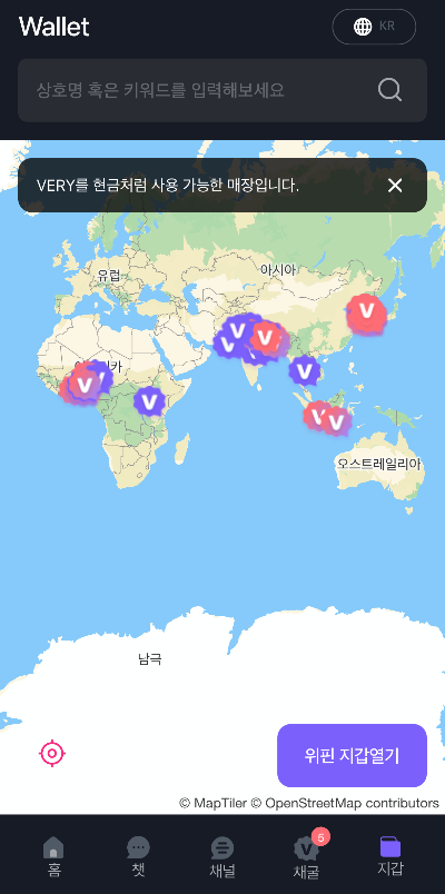 또한 '지갑' 탭의 지도를 보면 VERY 토큰을 현금처럼 사용할 수 있는 매장을 표시하는 기능이 있습니다.