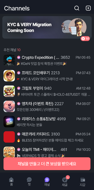 '채널' 탭에서는 다른 유저들이 만든 다양한 주제의 대화방에 참여하고 소통할 수 있습니다.