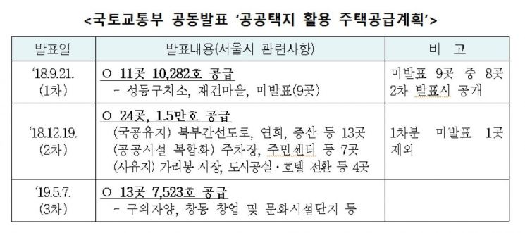 서울시와 국토부는 '수도권 30만가구 공급'을 목표로 3차에 걸친 공급계획을 발표했다. 47곳(3만2000)은 서울 지역에 공급되는 물량이다. 서울시는 2차 공급계획 발표 직후인 지난해 말 '주택 8만가구 추가공급 계획'을 발표, 1·2차 발표 부지인 35곳(2만5000가구)을 2022년 착공을 목표로 추진한다고 밝힌 바 있다. 올해 5월 발표한 3차 발표 부지는 구의자양 재정비촉진1구역(1363가구), 창동역 창업·문화산업단지(200가구) 등 13곳(7523가구)이다.